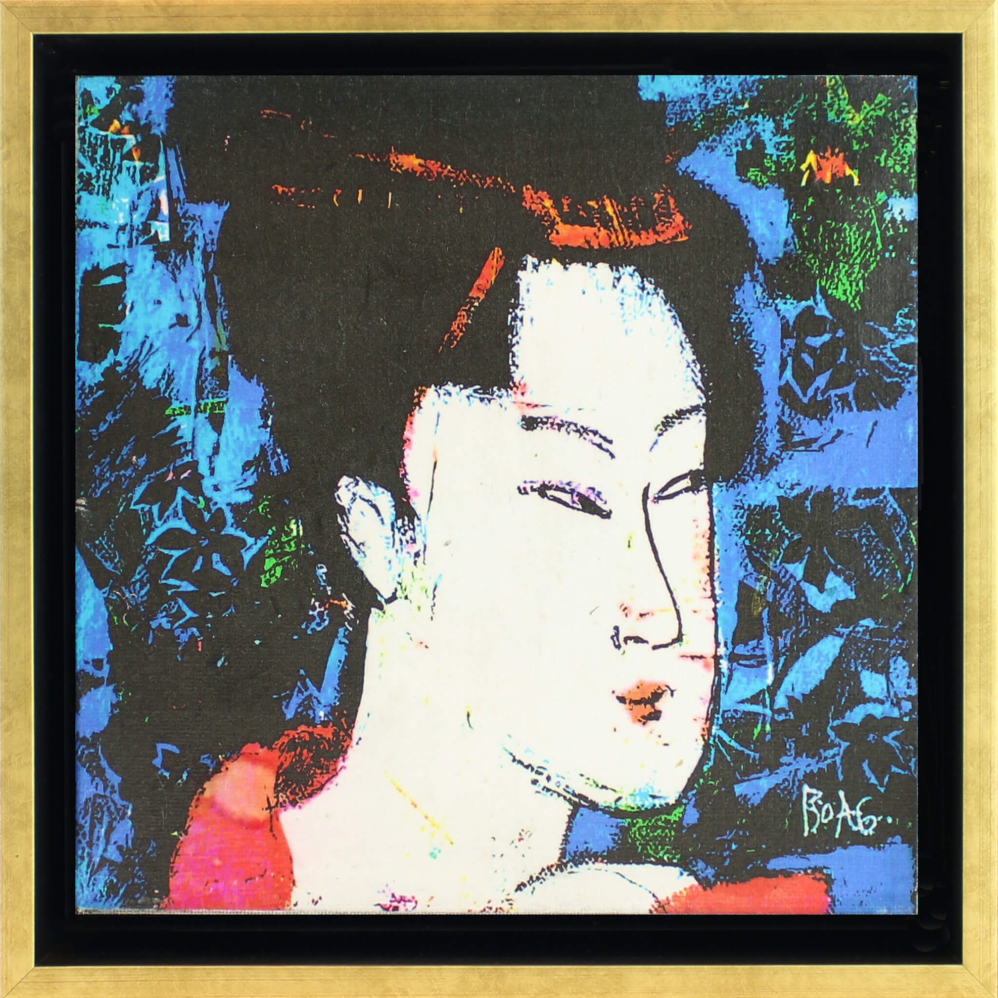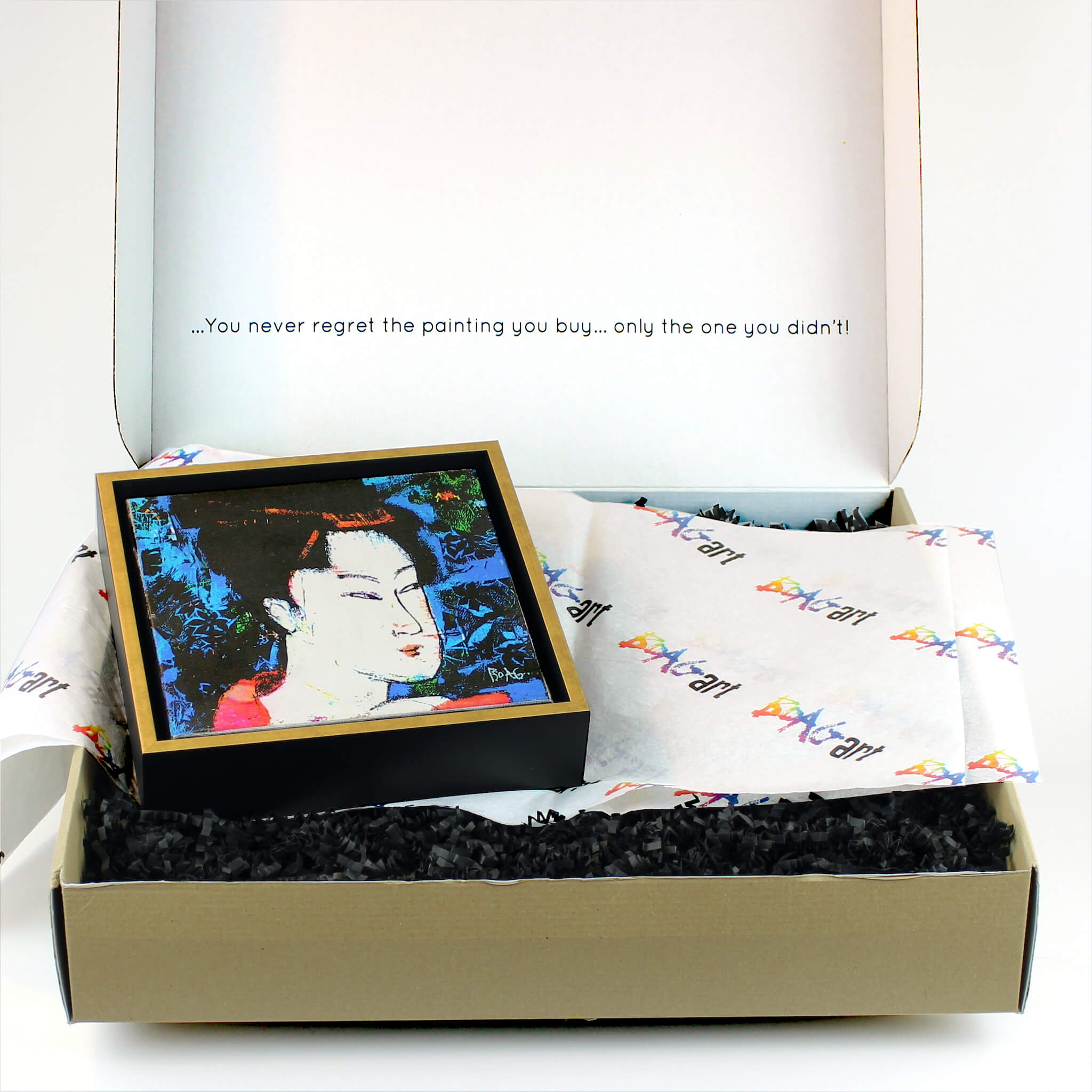The finished work is then framed in a black & gold shadow gap frame, echoing the Japanese aesthetic.
